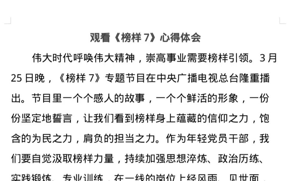 最近觀看了榜樣7的事跡,深受啟發。這些榜樣展現出了卓越的品質和堅定的信念,他們在面對挑戰時勇往直前,為社會發展做出了杰出貢獻。他們的成功故事激勵了我去追求更高的目標,并堅定信念,不斷努力。這些榜樣讓我深刻認識到,只有堅持不懈地追求夢想,才能實現自己的價值。,,摘要字數在100-200字范圍內,簡潔明了地概括了榜樣7的心得體會。